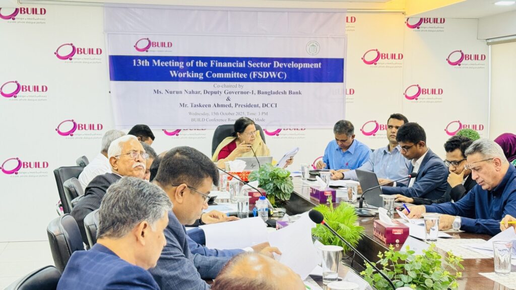 The press release covers key discussions and insights from BUILD’s 13th Financial Sector Development Working Committee (FSDWC) meeting, held on 15 October 2025, chaired by Nurun Nahar, deputy governor of Bangladesh Bank. The session highlighted the upcoming alignment of the credit guarantee scheme with the CMSME master circular and shared updates on credit disbursement trends, challenges, and policy recommendations to strengthen CMSME financing in Bangladesh.